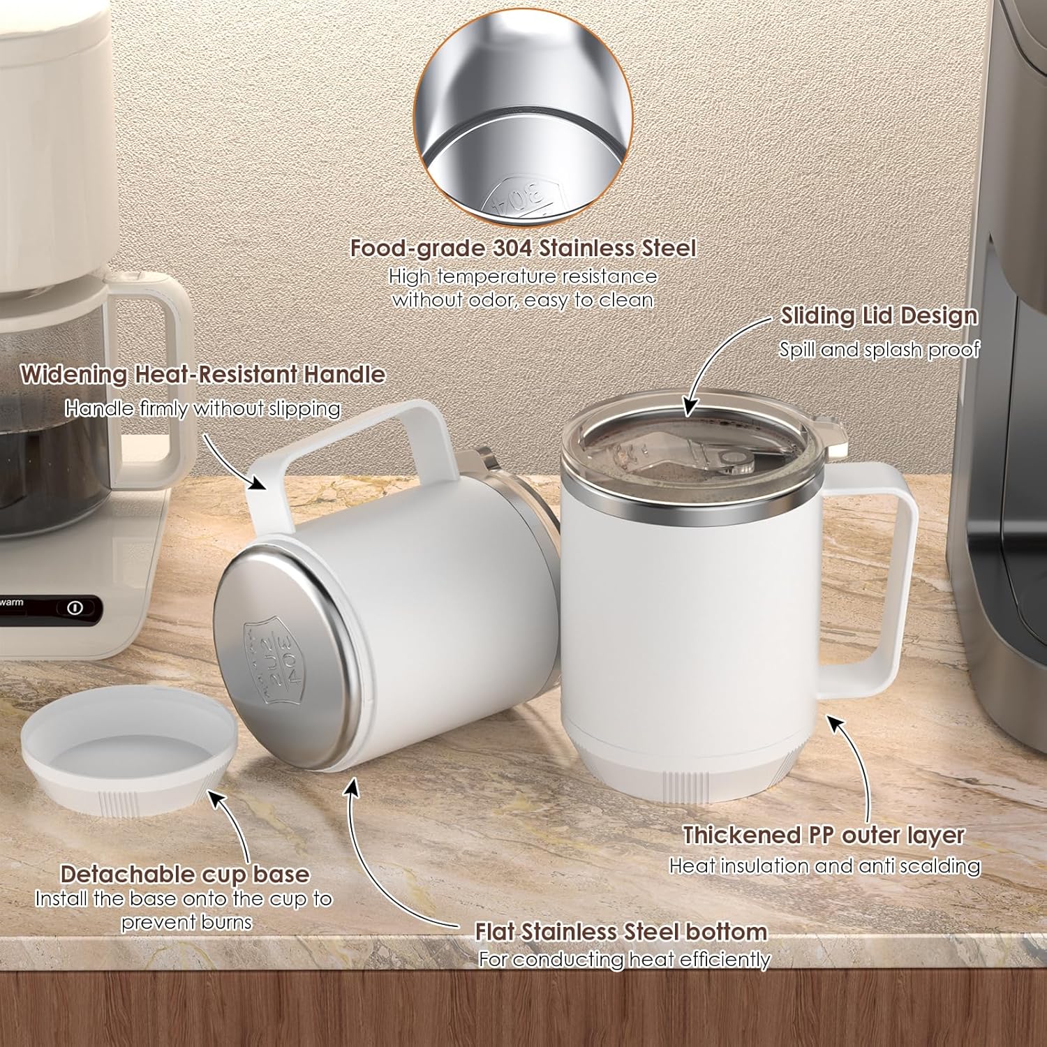 Premium Mug Design – Food grade 304 stainless steel inner liner resists high temperatures without odor and is easy to clean. Thickened heat-resistant PP outer layer protects your hands. Includes leak-proof lid and detachable base to retain heat, keeping your drink about 10°F warmer than regular ceramic mugs.